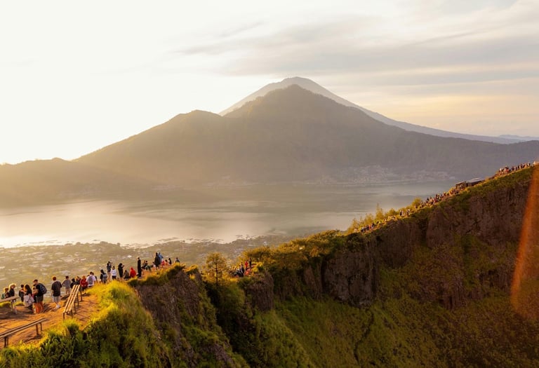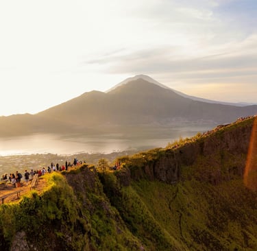 Description: Mount Batur is an active volcano located in the Kintamani district of Bali, offering one of the island's most iconic sunrise experiences. The trek typically starts in the pre-dawn darkness, guided by experienced local trekkers. The ascent to the summit (approximately 1,717 meters above sea level) takes about 1 to 1.5 hours, winding through volcanic rock and lush vegetation. Upon reaching the peak, trekkers are rewarded with an awe-inspiring panoramic view: the sun rising majestically over the Lombok Strait, illuminating the caldera lake (Lake Batur), and revealing the surrounding volcanic landscape, including the distant Mount Rinjani on Lombok. Often, guides will prepare a simple breakfast cooked by the volcano's steam. The descent offers different perspectives of the caldera and surrounding agricultural lands.