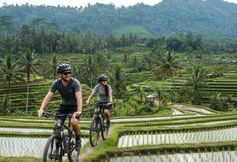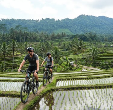 Description: Continuing your journey through Bali's heartland, immerse yourself in the emerald splendor of the Jatiluwih Rice Terraces, a designated UNESCO World Heritage site. These sprawling, cascading paddies are a testament to the traditional Balinese "Subak" irrigation system, a democratic and community-based system for water management. A cycling tour through Jatiluwih offers an intimate and refreshing way to experience this breathtaking landscape. Pedal along narrow paths, past local farmers tending their crops, and soak in the panoramic views of vibrant green stretching as far as the eye can see. It's an active yet peaceful way to connect with Bali's agricultural soul and stunning natural beauty.