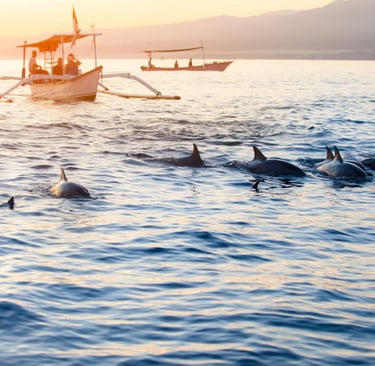 Description: Lovina Beach, located on Bali's north coast, is renowned for its tranquil black sand beaches and, more famously, for its resident pods of spinner and bottlenose dolphins. Unlike some heavily commercialized dolphin encounters, Lovina offers the chance to see these magnificent creatures in their natural habitat at sunrise. The experience typically begins before dawn, where local fishermen, in their traditional outrigger boats (jukung), guide visitors to the open sea. As the sun begins to paint the sky with vibrant hues, the dolphins emerge, leaping and playing in the calm waters, often in large numbers. It's a truly magical and humbling encounter, offering a glimpse into the wild marine life of the Bali Sea.