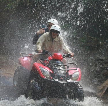Description: Shift gears from spiritual serenity to high-octane excitement with an ATV (All-Terrain Vehicle) adventure! Typically located in the lush jungles surrounding Ubud or the Payangan area, this thrilling activity allows you to navigate challenging terrains, muddy trails, rice fields, dense forests, and even underground tunnels. After a safety briefing and practice session, you'll roar through Bali's rugged landscapes, splashing through puddles, conquering inclines, and experiencing an adrenaline rush like no other. It's a fantastic way to explore the island's interior with an added element of fun and adventure, perfect for those seeking an exciting contrast to the day's earlier activities.