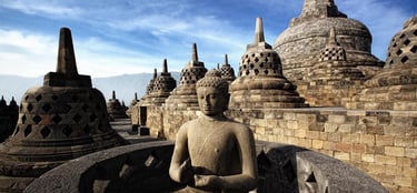 Borobudur Temple: The largest Buddhist monument in the world, located near Magelang, known for its massive scale and intricate relief panels illustrating the path to enlightenment (a UNESCO World Heritage Site).