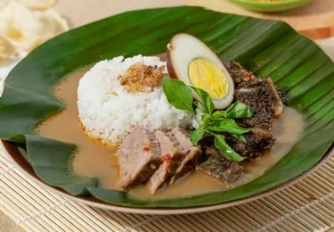 Nasi Gandul: A traditional dish from Pati. Rice is served on a banana leaf and generously topped with a savory, slightly sweet beef/offal stew, characterized by its thin, rich broth.