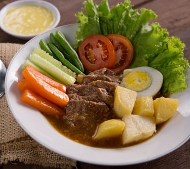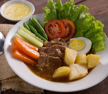 Selat Solo: True to its name, this dish is a culinary specialty of Central Java originating from Solo (Surakarta). It features a mix of vegetables such as green beans, carrots, and potatoes, topped with sliced meat roulade (or minced beef patty) and green peas. The entire dish is then generously coated with a savory, slightly sweet, reddish-orange sauce.