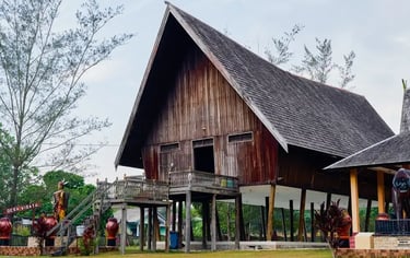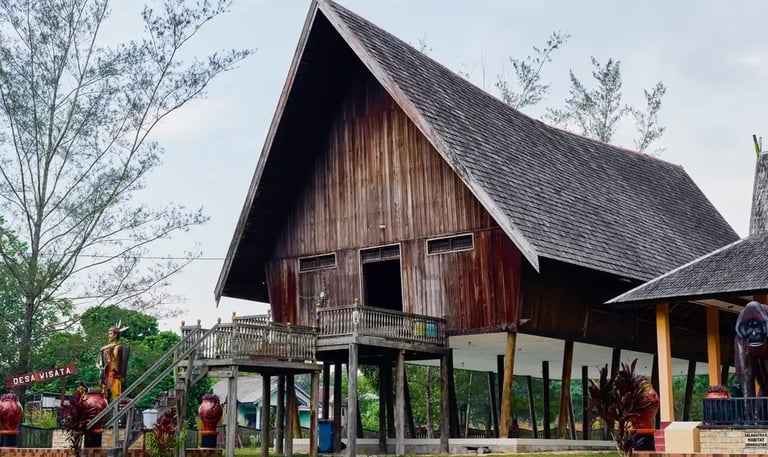 Rumah Betang: The traditional communal longhouse, symbolizing the collective spirit of the Dayak community.