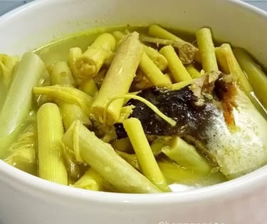 Juhu Singkah: A traditional Dayak soup featuring fish (often river catfish or patin) cooked with Umbut Rotan (young rattan shoots). The rattan adds a distinctive, slightly bitter, and crunchy element to the savory soup.