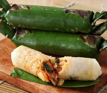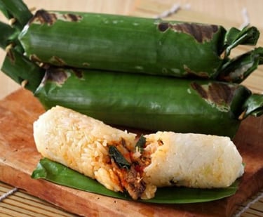 Lalampa: A popular savory snack (similar to Lemper). It is sticky rice filled with spiced shredded fish or chicken, wrapped tightly in banana leaves, and then grilled until the leaves are charred and fragrant.