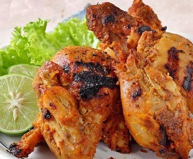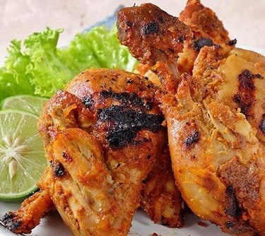 Ayam Iloni: Grilled chicken that is first marinated in a rich mixture of coconut milk, ginger, turmeric, and garlic. The coconut milk marinade creates a savory, slightly creamy glaze on the charred chicken.