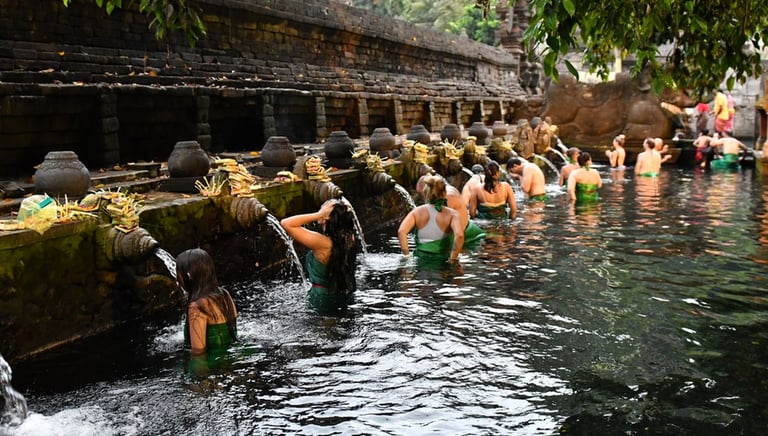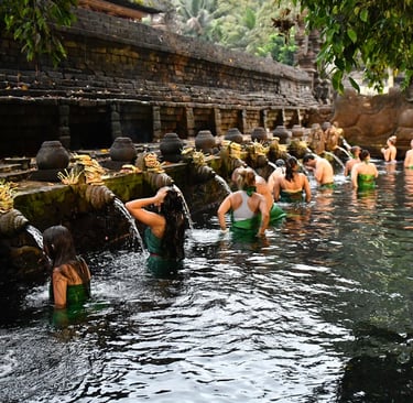 Pura Tirta Empul🙏: Partisipasi aktif dalam ritual Melukat (pemurnian) di mata air suci yang dipercaya memiliki kekuatan penyembuhan.