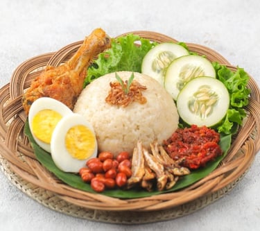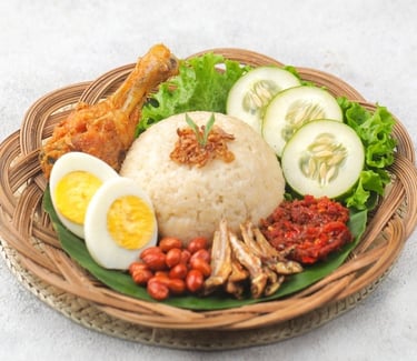 Nasi Gemuk: A savory rice dish similar to Nasi Uduk or Nasi Lemak, cooked with coconut milk and served with hard-boiled egg, peanuts, anchovies, and chili sauce.