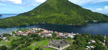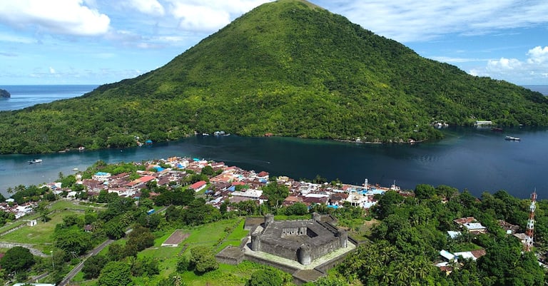Banda Neira: A living museum. Visitors can explore Fort Belgica (a well-preserved Dutch pentagonal fortress), snorkel in pristine waters, and trek the active volcano Gunung Api Banda.