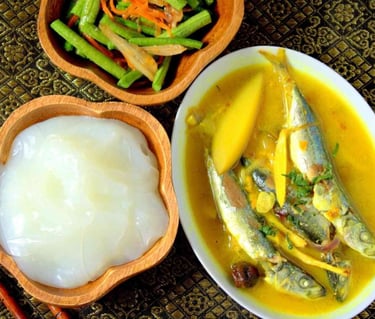 Papeda and Ikan Kuah Kuning: The staple meal of Maluku. Papeda is a glue-like, translucent porridge made from sago starch. It has a bland taste, so it is swallowed (not chewed) with Ikan Kuah Kuning, a fish soup cooked in a rich, sour, and savory turmeric broth with kenari nuts and basil.