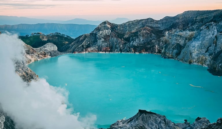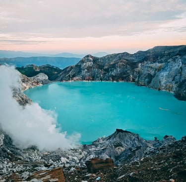Ijen Crater is home to a massive turquoise-colored lake, known as Java's largest acidic lake and the most acidic crater lake in the world. The stunning, milky blue-green water provides a breathtaking contrast to the rugged, yellow-sulfur-stained volcanic walls. Watching the sunrise paint the surrounding landscape in warm hues from this vantage point is a moment of pure awe.