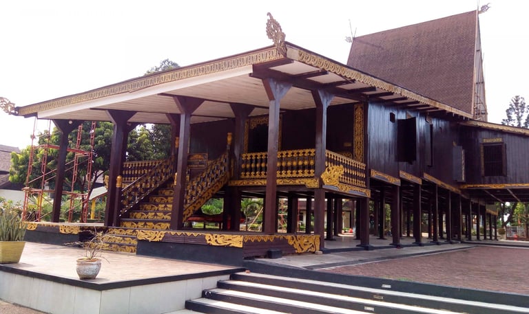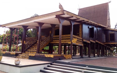 Rumah Banjar (Banjar House): The traditional house, built on stilts or rafts, features a distinctive, dramatically steep, extended roof (atap bubungan tinggi), symbolizing the royal architecture of the former Sultanate.