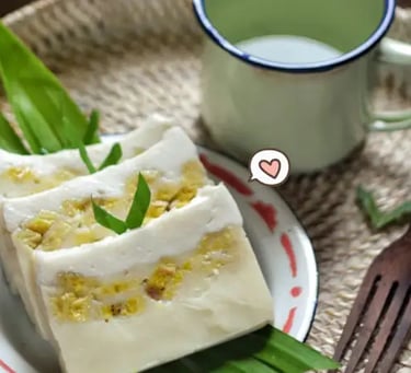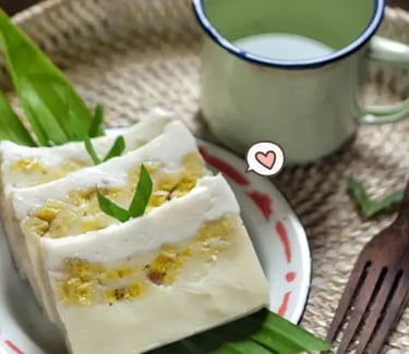 Amparan Tatak: A traditional sweet cake (kue) often served during ceremonies. It is a layered pudding made from rice flour, coconut milk, and sugar, featuring sliced bananas within its texture.