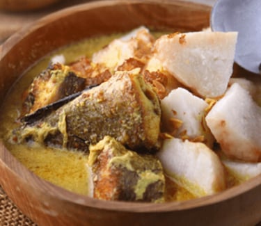 Ketupat Kandangan: Rice cakes (ketupat) served with a thick, savory yellow sauce made from coconut milk, turmeric, and local spices, traditionally accompanied by smoked or grilled river snakehead fish (ikan haruan).