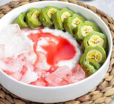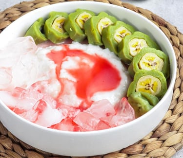 Es Pisang Ijo: A signature dessert. Sliced green bananas wrapped in a green rice flour crepe (colored with pandan), served with sweet coconut milk porridge (bubur sumsum), syrup, and shaved ice.