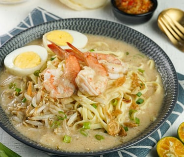 Mie Celor: Thick yellow noodles served in a rich, creamy, shrimp-based coconut milk broth, often topped with shrimp, hard-boiled eggs, and scallions.