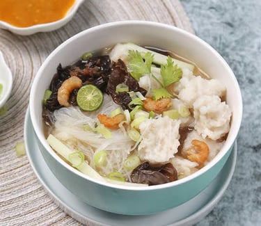 Tekwan: A light soup made with fish paste balls (smaller and softer than pempek) served with vermicelli noodles, mushrooms, and a clear, savory shrimp broth.