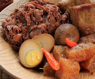 Gudeg: The absolute icon of Yogyakarta. It is made from young jackfruit (nangka muda) slow-cooked for hours in coconut milk and large quantities of palm sugar. This lengthy process results in a sweet, soft, and brownish-red dish, typically served with boiled egg, chicken, krecek (spicy cow skin stew), and areh (thick coconut milk gravy).
