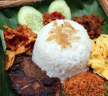 Nasi Kucing: Literally "cat rice," so named because of its small portion size. It is a portion of rice wrapped in banana leaf, served with a small piece of topping (often fried tempeh, ikan teri (anchovies), or chili sauce), and is a popular, inexpensive street food in the area.
